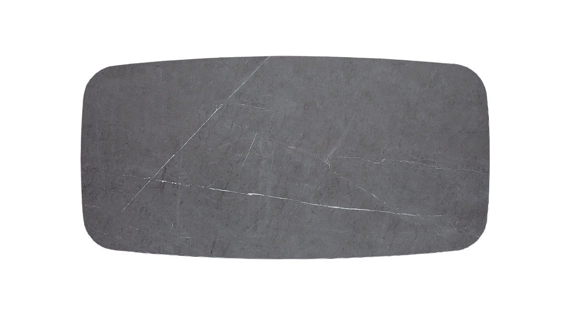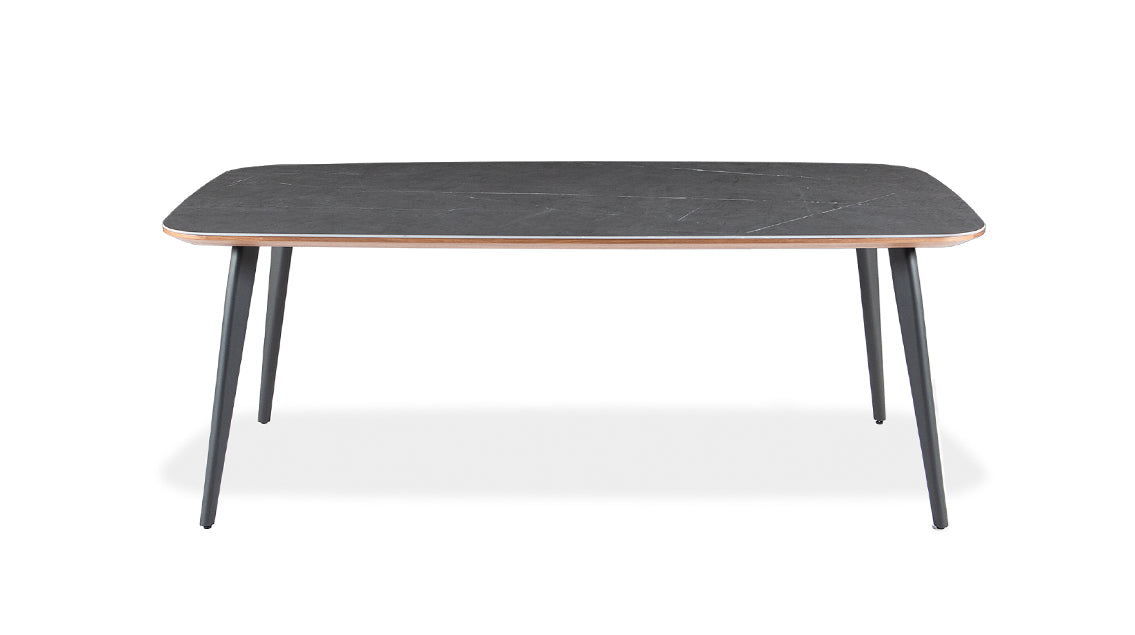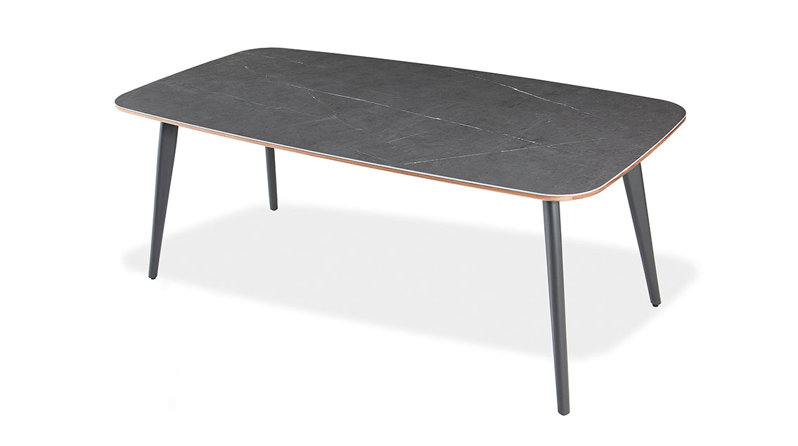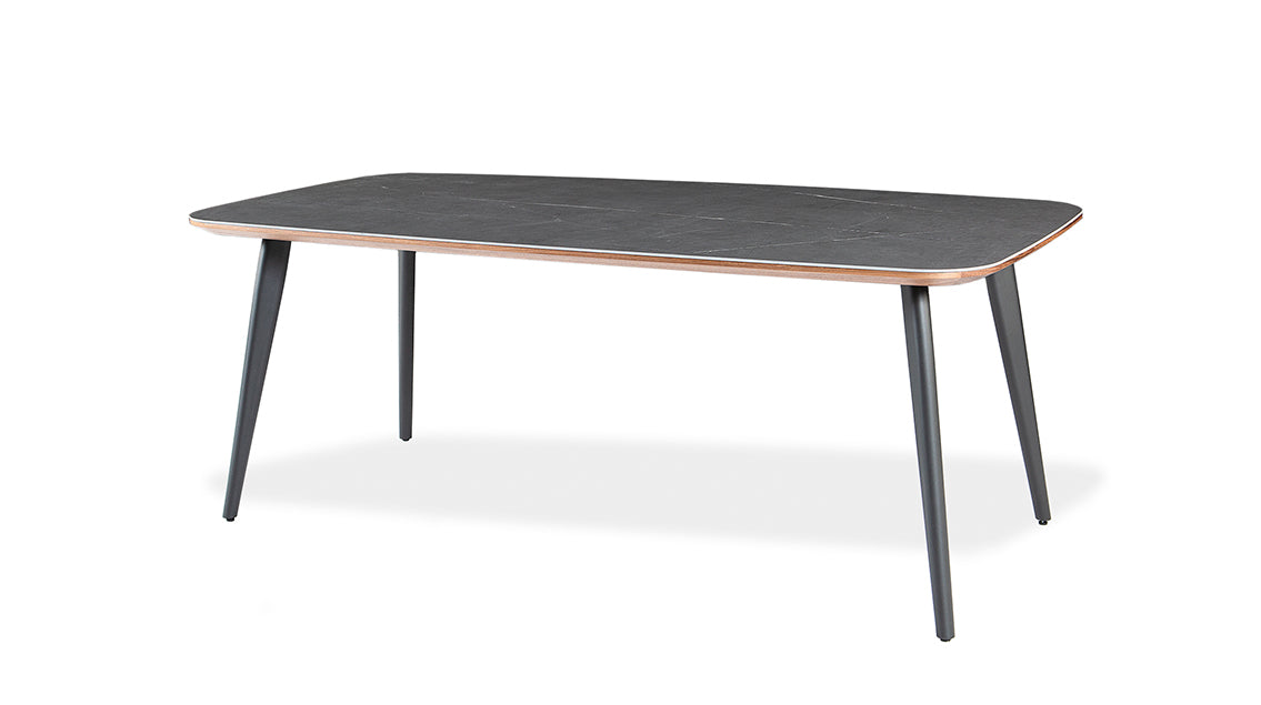 Arthur is a versatile table, featuring metal legs and a matt grey porcelain top placed upon wood. Its rounded edges and bevelled wood add to its elegance.
