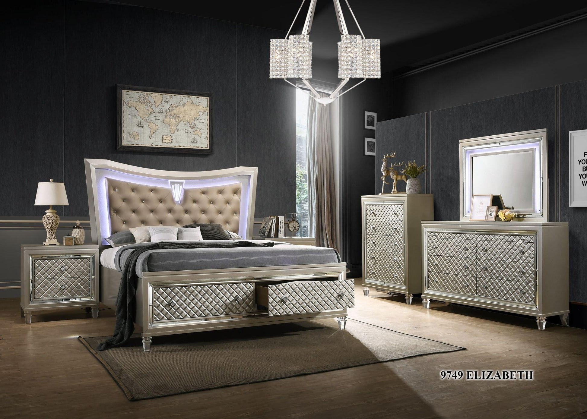 Cet ensemble complet de chambre comprend un somptueux lit king-size finition argent avec tiroirs et éclairage LED sur la tête de lit. L’ensemble inclut également une commode avec miroir, deux tables de chevet et un coffre, alliant style moderne, fonctionnalité et élégance.