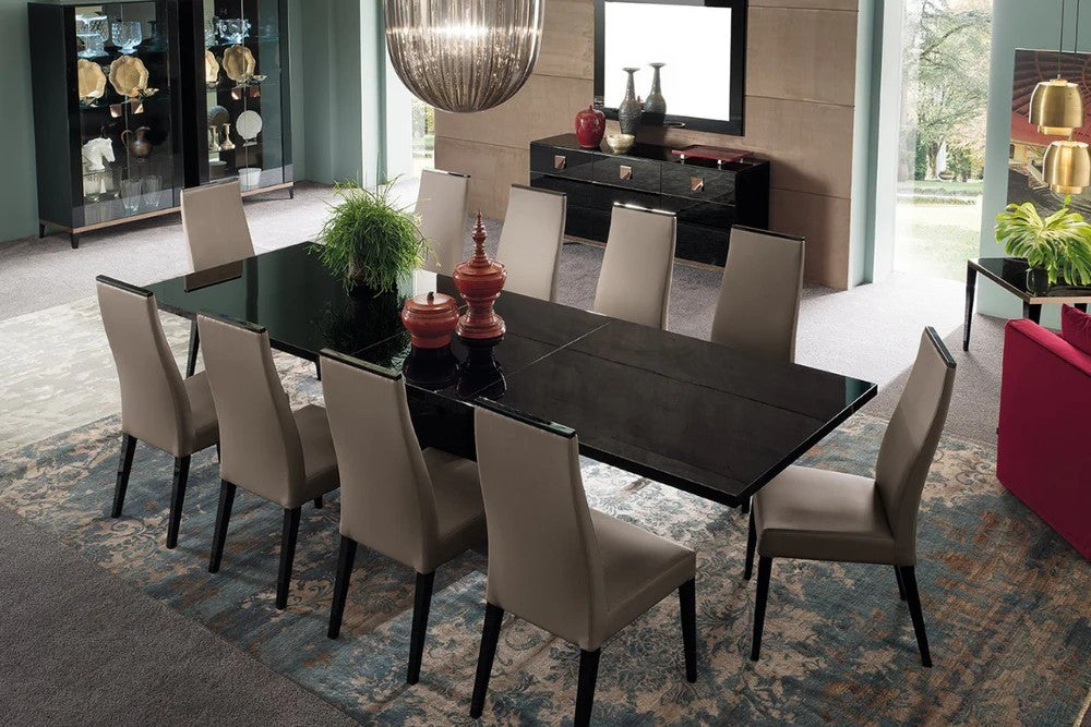 La salle à manger Mont Noir présente une finition noire brillante avec des accents cuivrés métalliques, alliant sophistication intemporelle et style moderne. Conçue en polyuréthane durable et de haute qualité, elle est idéale pour un usage quotidien et s’harmonise parfaitement avec la collection chambre Mont Noir pour compléter l’allure luxueuse de votre intérieur.
