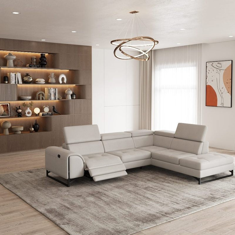 Le sectionnel i916 L offre confort et style à l’italienne, avec ses fauteuils inclinables électriques, appuis-tête réglables et cuir de qualité pour un look moderne et élégant.