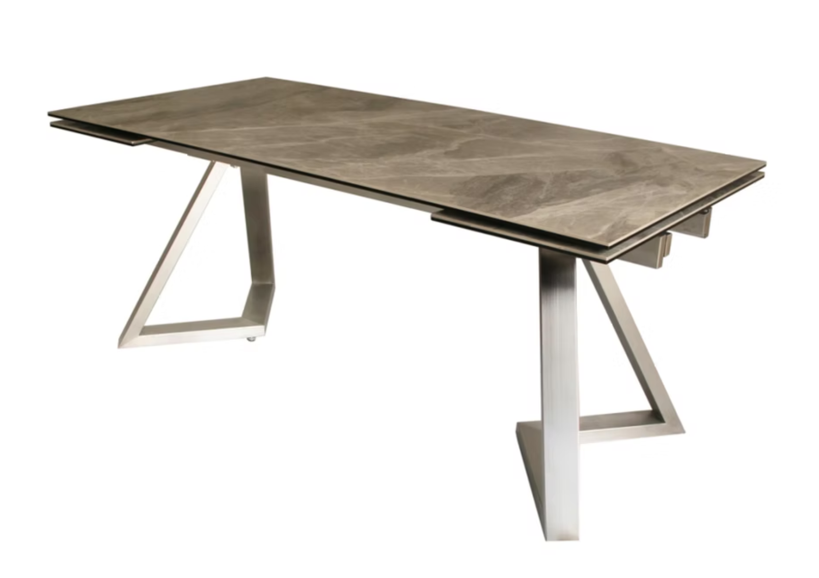 La table à manger Santos allie design moderne et praticité, avec un plateau en céramique et un pied en acier inoxydable, extensible pour s’adapter à tous les espaces de repas.